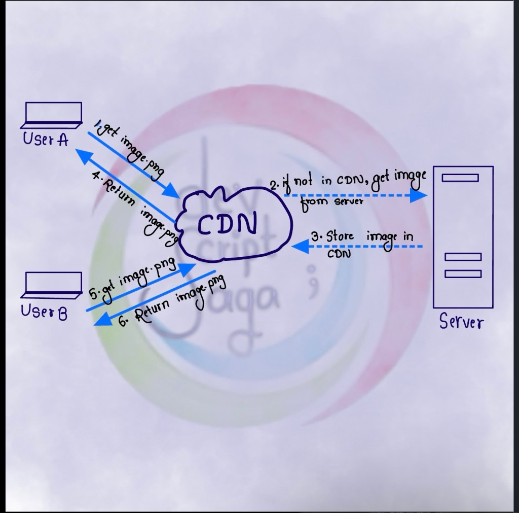 User A tries to get image.png by using an image URL. The URL’s domain is provided by the CDN provider. If CDN server does not have image.png in the cache, the CDN server requests the file from the origin, which can be a web server or online storage like Amazon S3.